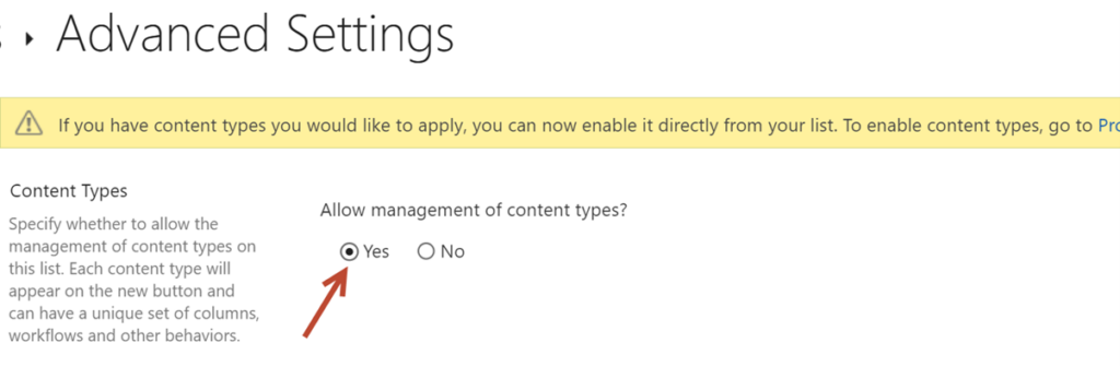 - Go to List settings -> Advanced settings -> select ‘yes’ in Allow management of content types -> click Ok