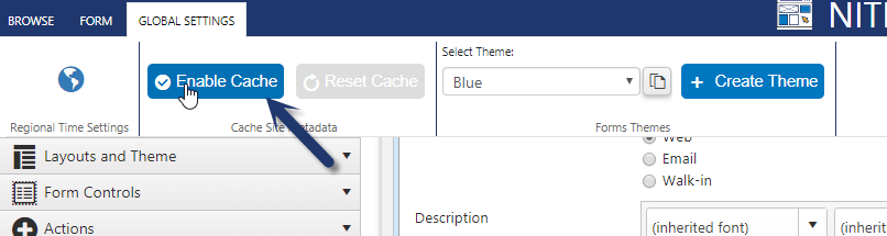 NITRO forms can cache the list metadata (column information, form settings etc.) instead of loading it every time. This helps improve performance significantly as this cache avoids fetching this data repeatedly and this data doesn’t get modified often. Form designers/administrators can reset the cache if any change is made to the list columns or form settings, this will automatically refresh the cache data for all users. Also, users can clear the browser cache to get the updated settings immediately. This settings applies to all the lists in the site.