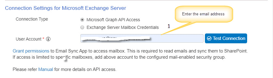 3. Select “Microsoft Graph API Access” in “Connection Settings for Microsoft Exchange Server” in Email Sync as shown below: