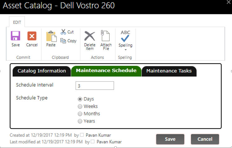 - By design, Assets list is linked to Asset Catalog and it has a column “Enable Maintenance”. If an Asset is maintenance enabled and it is linked to an Asset type (Catalog list item) that has maintenance configured, it creates the Tasks based on the maintenance schedule and the template information configured in the corresponding Asset type