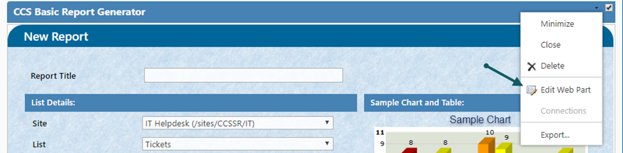Next go to Report Center document library –> Open “CCSReportsPageBaseTemplate” page –> Edit the page –> Edit Report Links web part –> Update the URL in “New Report Page URL” text box with the copied URL (see screenshot below).