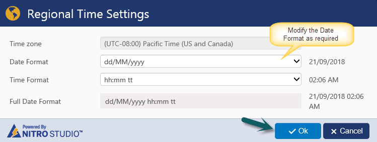 To modify the date time format, go to any list -> List Settings -> Crow Canyon NITRO Forms -> Switch to “Global Settings” tab and modify the Regional Time Settings as required.