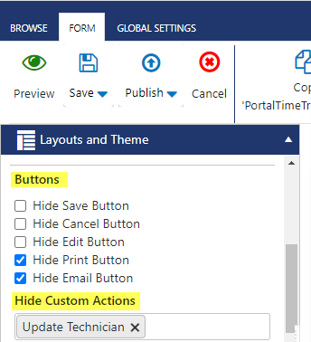 Note: If no changes are required on the item form for the portal site, then use the same form. Otherwise, create a new form. A new form is useful to show limited columns to the end user in the portal site. ‘PortalTimeTracking’ is the new form created for the portal site in this example. - The buttons that are not required on the portal forms can be hidden from the ‘Layouts and Theme’ section (in left-hand panel) -> ‘Buttons’. Check the buttons that are not required on the form. Similarly, hide any custom actions that shouldn’t be visible to portal users.