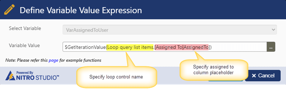 $GetIterationValue(Loop query list items,[Assigned To|AssignedTo])