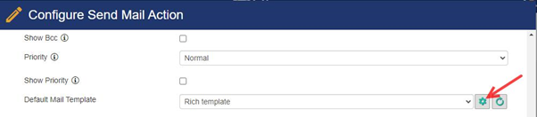 - Navigate to the list -> Custom actions -> Edit the required custom action -> Edit the ‘Send Mail’ action -> Click gear icon to navigate to ‘Mail Templates’.