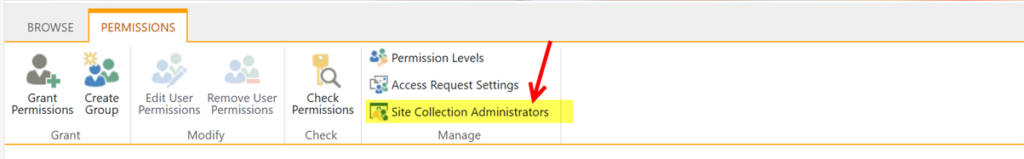 - In the top ribbon of this page you should see “Site Collection Administrators” as a link, click it.