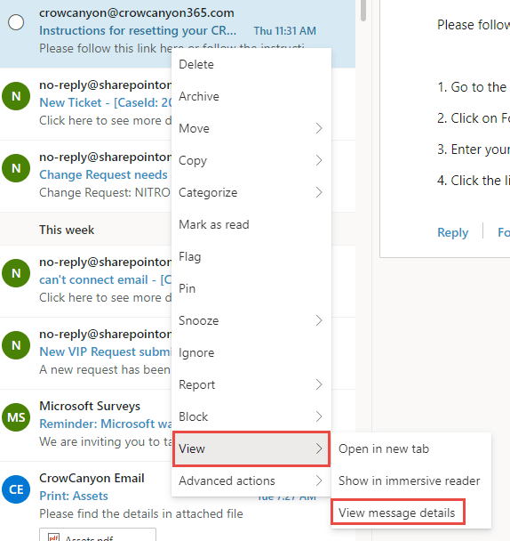 On the Outlook client, open the email in a separate window, click on File, then click on Properties: