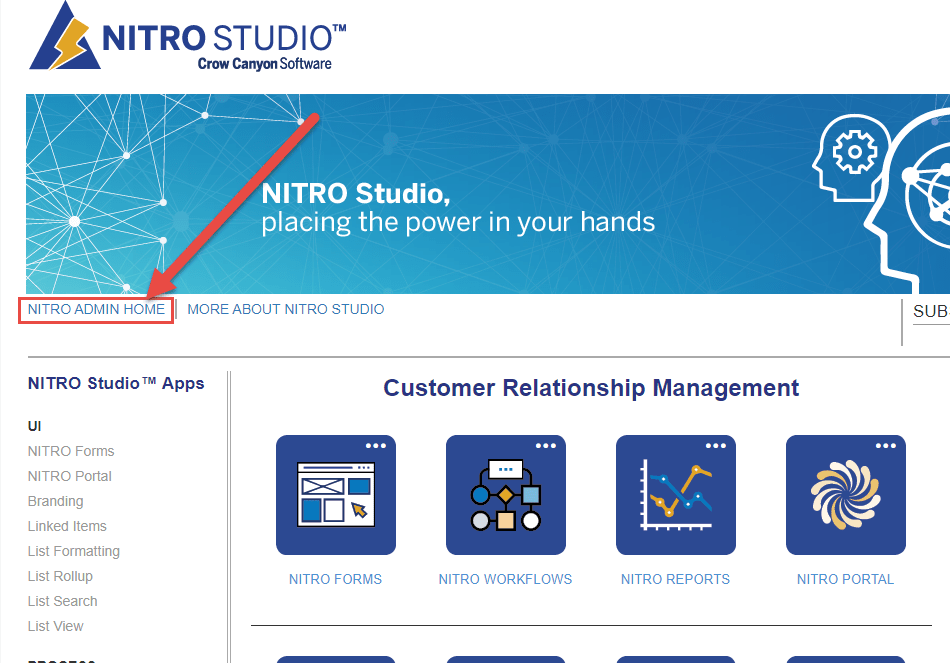 We have enhanced the Subscription Details page in NITRO Studio so that you can now see how many sites in your Site Collection have NITRO Studio activated. To see this information, first go to NITRO Studio and click on NITRO Admin Home: