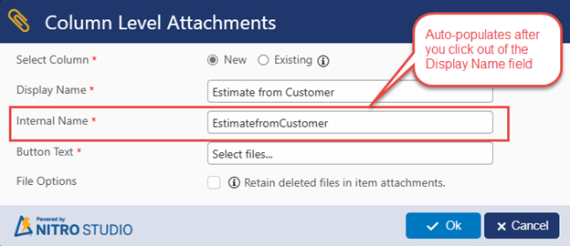 When creating a new column in NITRO, you no longer need to retype the internal name for the column. It will auto-populate without spaces: