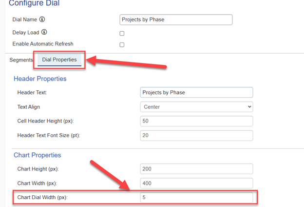 There is a new option to modify the width of the dial as shown in the web part. You’ll find this under Dial Properties -> Chart Properties -> Chart Dial Width:
