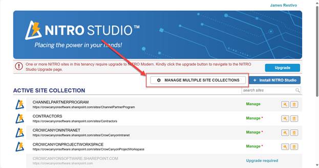 In other enhancement news, once you are upgraded to the Modern NITRO Studio 3.x series, you’ll be able to update all site collections at once, rather than one at a time. To access this feature, navigate to https://crowcanyonnitro.azurewebsites.net/, and then click on Manage Multiple Site Collections: