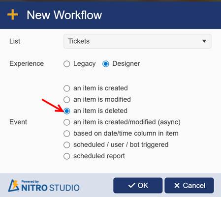 Go to the SharePoint list where you want to configure the workflow -> Click NITRO Workflows on the ribbon -> Create or edit a workflow and choose the “An item is deleted” event.