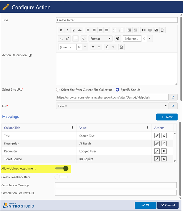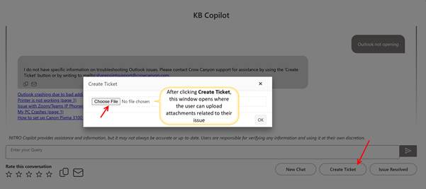 A new enhancement has been introduced in NITRO Copilot, allowing users to upload attachments at the time of ticket creation. This provides a more complete and seamless experience, enabling users to share relevant files, screenshots, or documents directly with their support request.