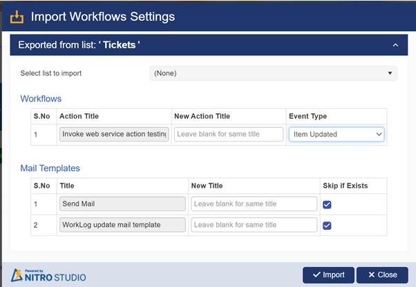 Import Workflows Settings window in NITRO Studio, used when importing workflows and related mail templates from another list.