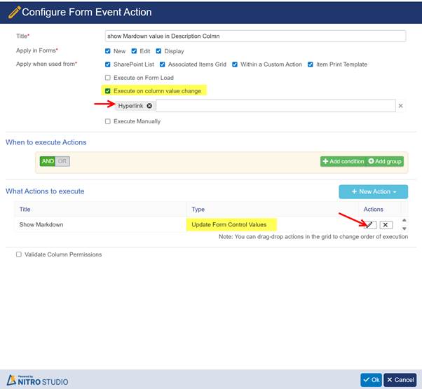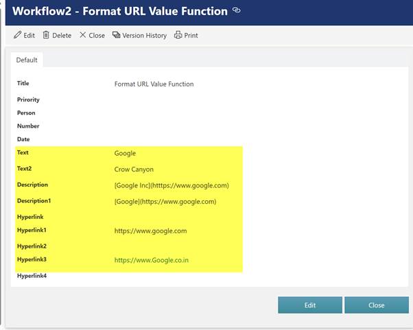 Form Event Action is executing when the column value for ‘Hyperlink’ column is changed. Based on Hyperlink column value, setting values in ‘Description’, ‘Text’ and ‘Description1’ column using ‘formaturlvalue’ function.