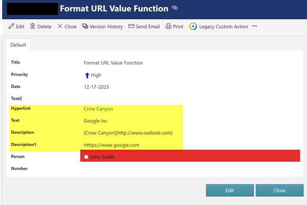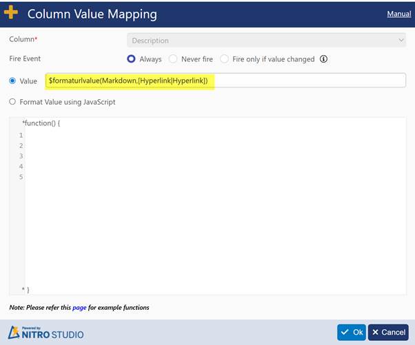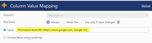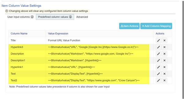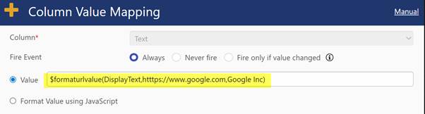 - Enhancement: New function ‘formaturlvalue’ to support setting hyperlink column value using markdown syntax ‘[link text](https://example.com)’ or the URL and link text.