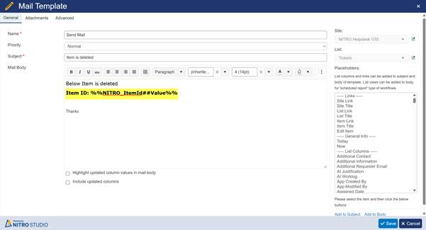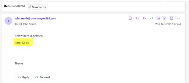 %%NITRO_ItemId##Value%% - When the item is deleted, the workflow triggers and the email is sent with the deleted item’s ID.