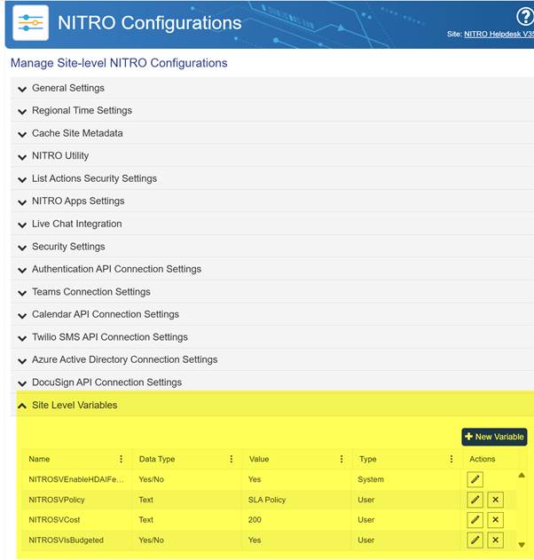 Site-Level Variables can be created and managed from the NITRO Site Settings page.