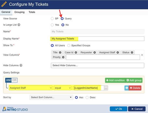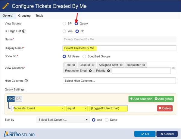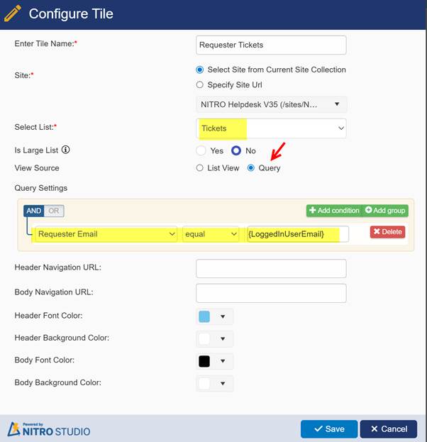 When configuring a view, you can add filter conditions using these placeholders. At runtime, NITRO will automatically replace them with the logged-in user’s actual Display Name or Email Address.