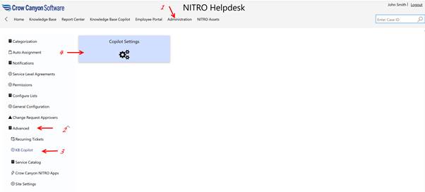 - Go to Helpdesk Application -> Administration in Top link bar -> Advance Section in left panel -> KB Copilot -> click Copilot Settings tile