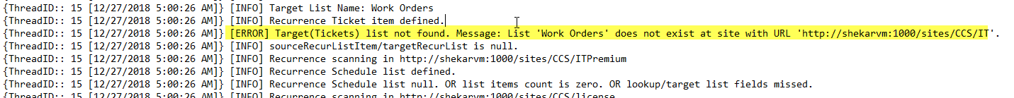 Recurring Tickets not created as per the schedule. When we enable the information logs, exception occurs that list is not found as shown below