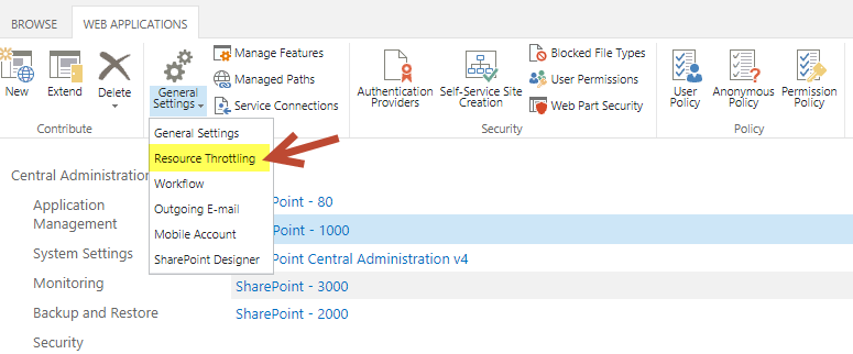Go to SharePoint Central Administration –> Application Management –> Manage Web Applications –> Select the web application and click on “Resource Throttling” under general settings as shown below.