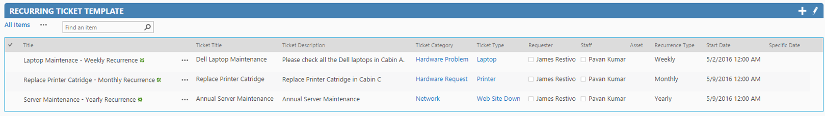 1. Create a new list “Recurring Ticket Template” in helpdesk site like below.