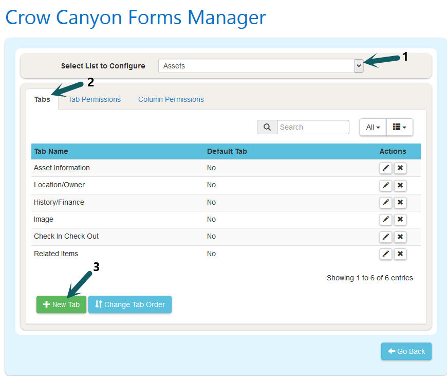 1. Navigate to Forms Manager App from either Site Contents or Crow Canyon Application Administration. Select Assets list and create tab for Vehicle related fields in the list as shown below using Forms Manager App: