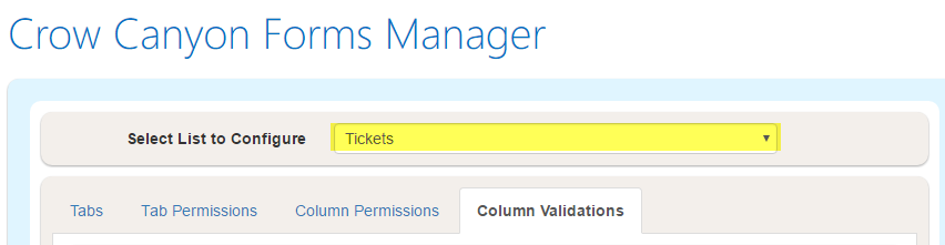 Go to Crow Canyon Forms Manager Add-in (App) from Application Administration or Site Contents. Select ‘Tickets’ list in the list dropdown.