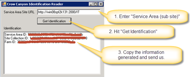 4. Send us the generated information in the textbox (Service Area ID, Site Collection ID, Farm ID). We will generate and send you a license key.
