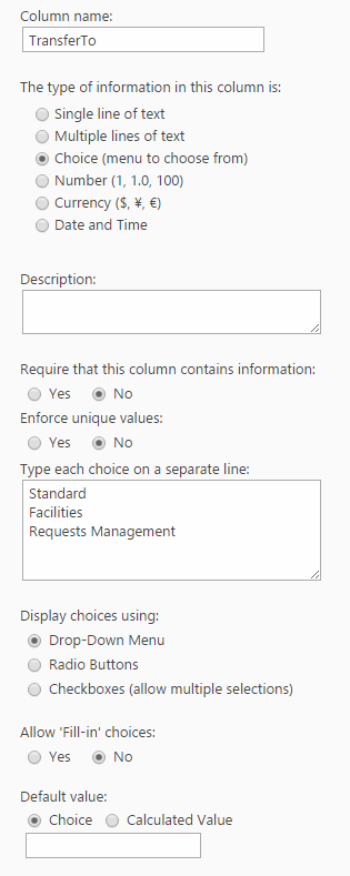 1. Go to list settings of Tickets list (source list), create a Choice field in tickets list (say "TransferTo") with target sites as the options. Here we should give names for other Service Areas where Ticket could be transferred from this site: