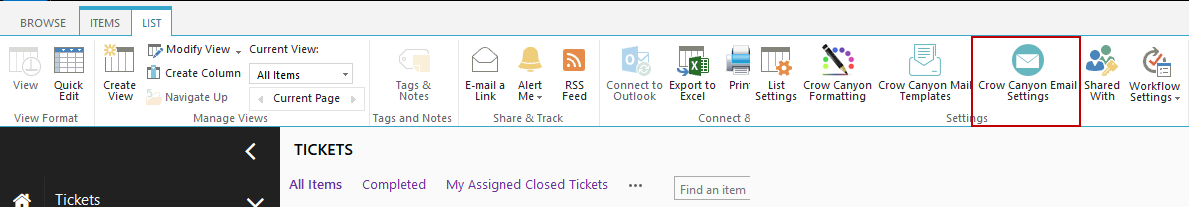 1. Open Tickets list from Site Contents and Click on ‘Crow Canyon Email Settings’ under ‘List’ ribbon