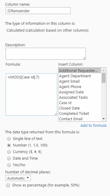Go to Application Administration –> configure lists –> configure Tickets –> create a Calculated column in Tickets list to get reminder of Ticket ID when divided by a particular number. In our example below, we have configured Survey link on every 7th Ticket (Ticket ID is a multiple of 7).