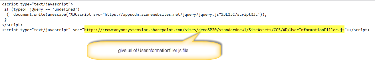 Go to Site Contents –> SiteAssets–>CCS folder–>AD –> Copy the url of UserInformationFiller.js file and replace the url in