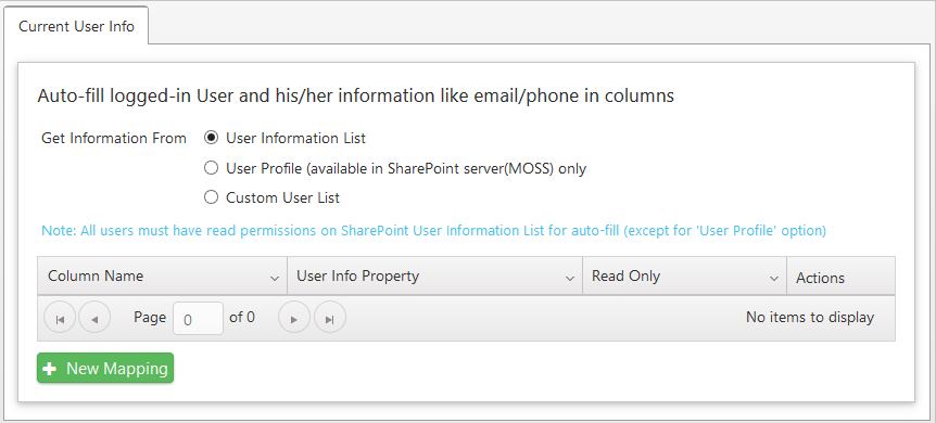 Note: All users must have read permissions on SharePoint User Information list for auto -fill. To know how to configure permissions on ‘User Information List’ refer under ‘Set Permissions on List’ section in ConfigurationsonUserInformationList