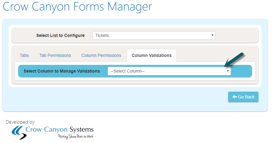 Go to Application Administration –> Crow Canyon Nitro Apps –> Crow Canyon Forms Manager app –> Select Tickets list –> Go to Column Validations section –> Select "Resolution Notes" column.