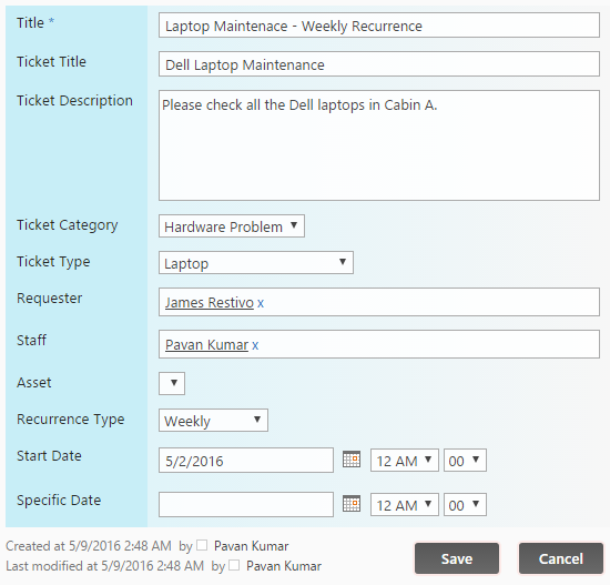 Go to Recurring Ticket Template list and create a new item like below with Recurrence Type as ‘Specific Date’ and fill the Specific Date.