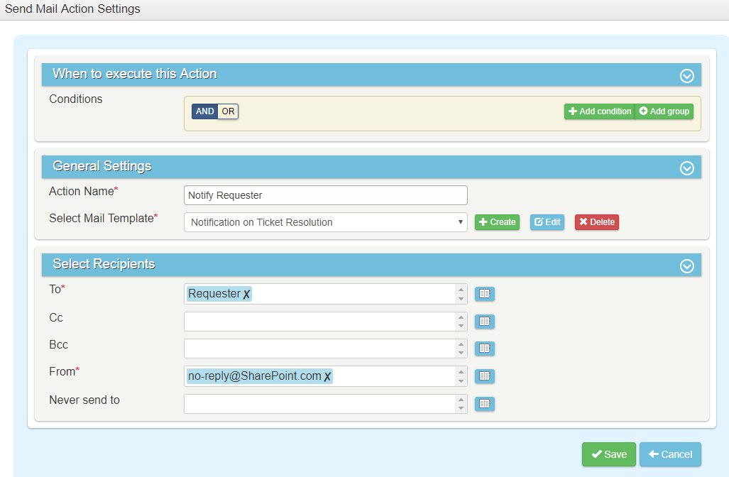 2. Configure a send mail action like shown below to notify Requetser. Create/configure a mail template as needed.
