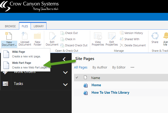 Web Part page (Workspace) is intended to get cumulative information like list items, reports, assinged tasks, unassinged tasks at a single page. To create a web part page (Workspace), go to site contents –> Site Pages library, click on files menu in ribbon, and add a web part page