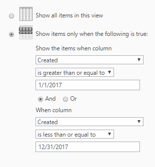 2. If we are intended to show the report on filtered view like only one year items etc., create a filtered view like shown below which shows the tickets created/closed for the 2017 year. If we would like to build report on all ticket, we can use "All Items" view.