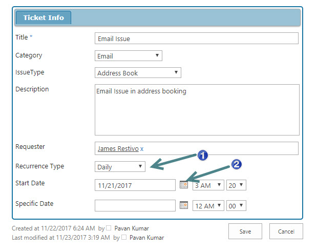 - Create item in Recurring Ticket Template list and select Recurrence Type as "Daily" and select start date for recurrence