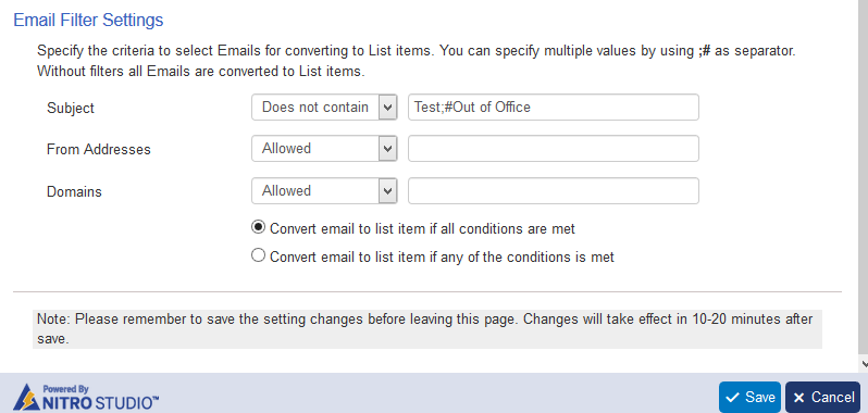 – Sync service creates an item in the Email Tickets list for every new email that comes to the mailbox configured in the Email Sync Setting. The email sync setting has a filter that can be configured which might be blocking creation of items. For example, we might block certain emails to convert as an Email Ticket if subject contains “Test” or “Out of Office” emails. See sample filter screenshot below. Please check the mails that didn’t reach Email Tickets list if verify if they match the conditions specified in the filter settings.