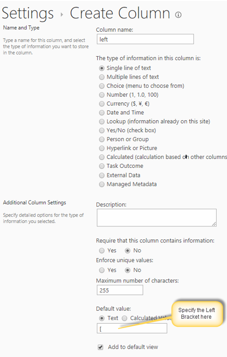 a. Create one field, “left” with default value “[“and another field, “right” with default value “]”. To create new fields, please go to Application Administration –> Configure lists –> Configure Tickets and create new column as shown below