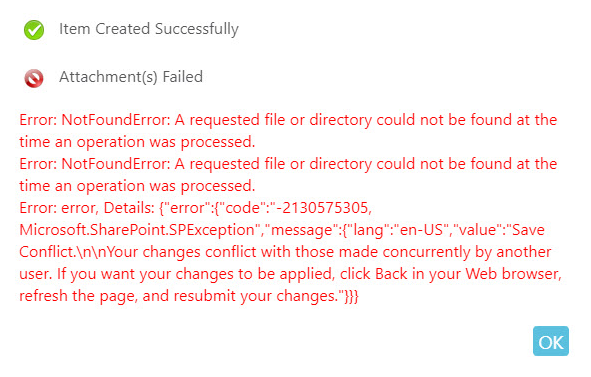 Error: error, Details: {“error”:{“code”:”-2130575305,Microsoft.SharePoint.SPException”,”message”:{“lang”:”en-US”,”Value”:”Save Conflict.\n\nYour Changes conflict with those made concurrently by another user. If you want your changes to be applied, click Back in your Web browser, refresh the page, and resubmit your changes.”}}}