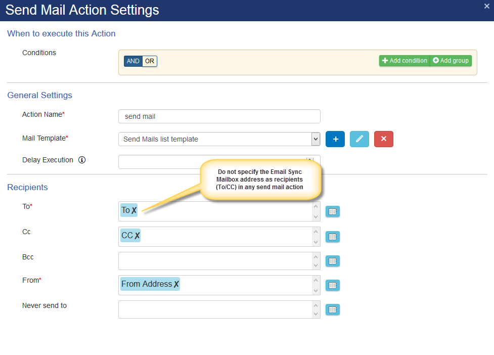 2. Always configure “Never Send to” in the Send Mail Action in Workflow Manager workflows to specify the Email Sync mailbox/account: