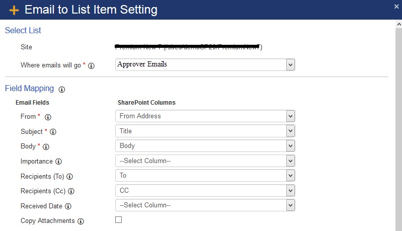 - Configure Email Sync settings using Crow Canyon Email Sync app on “Approver Emails” list as shown below. Pre-requisite is to have a valid mailbox that can be accessed using on-premises or online exchange web services.