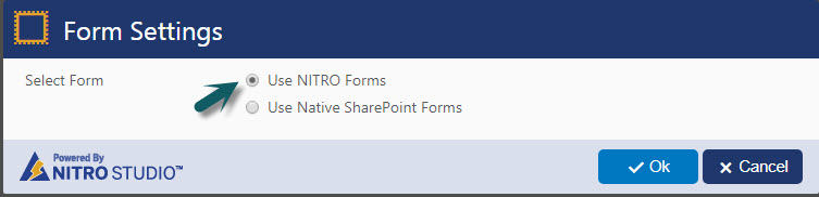 “Use Native SharePoint Forms” option uses the forms configured using the forms manager solution. To proceed with NITRO Forms configurations, please select “Use NITRO Forms” and click ok as shown in the below screenshot.