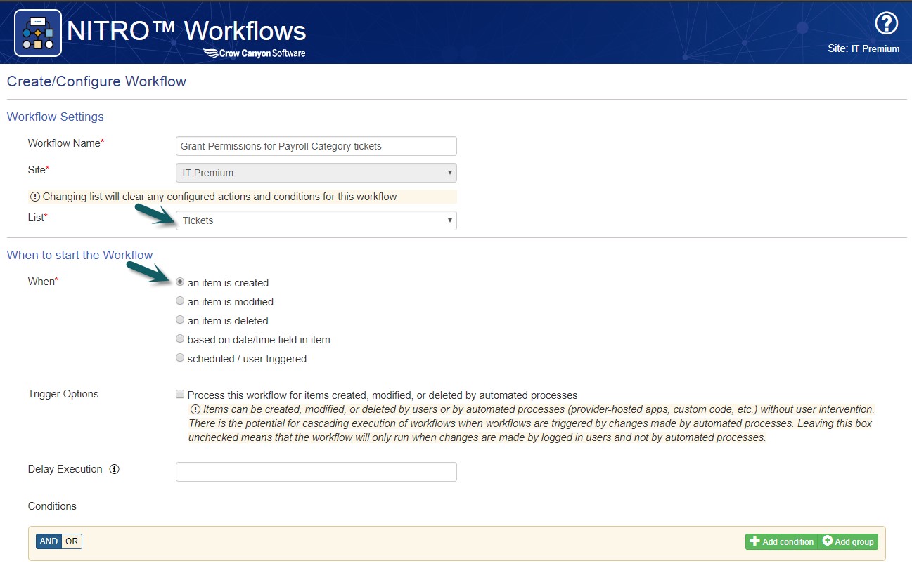2. Create another workflow on Tickets list on “item modified” event with the same configurations as described above with an additional condition i.e. Category equals “afterchange:Payroll”. This workflow will be triggered if Category of the Ticket is changed to “Payroll” and hence specific permissions need to be granted.