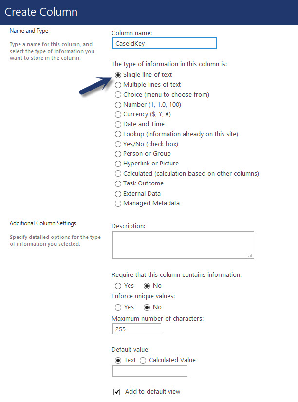 - Go to site contents –> Configurations list –> list settings –> NITRO Forms –> Create a single line of text column with internal name as “CaseIdKey” –> Add the column to General tab and publish the NITRO Forms. See sample screenshot below