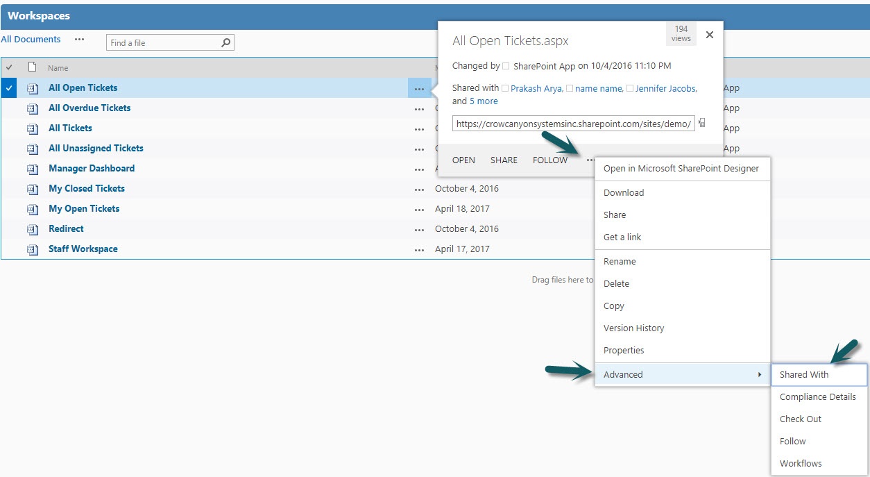 Option 2: Use SharePoint Designer to create a filtered list view. Use this if you would like to filter tickets based on a SharePoint Group. Create one SharePoint group per department (or any other criteria you need to use, e.g. location, Manager, etc). Use the “Assigned Team” column in the ticket to specify which group should see that ticket/request/work order. Configure the view filter using SharePoint designer.